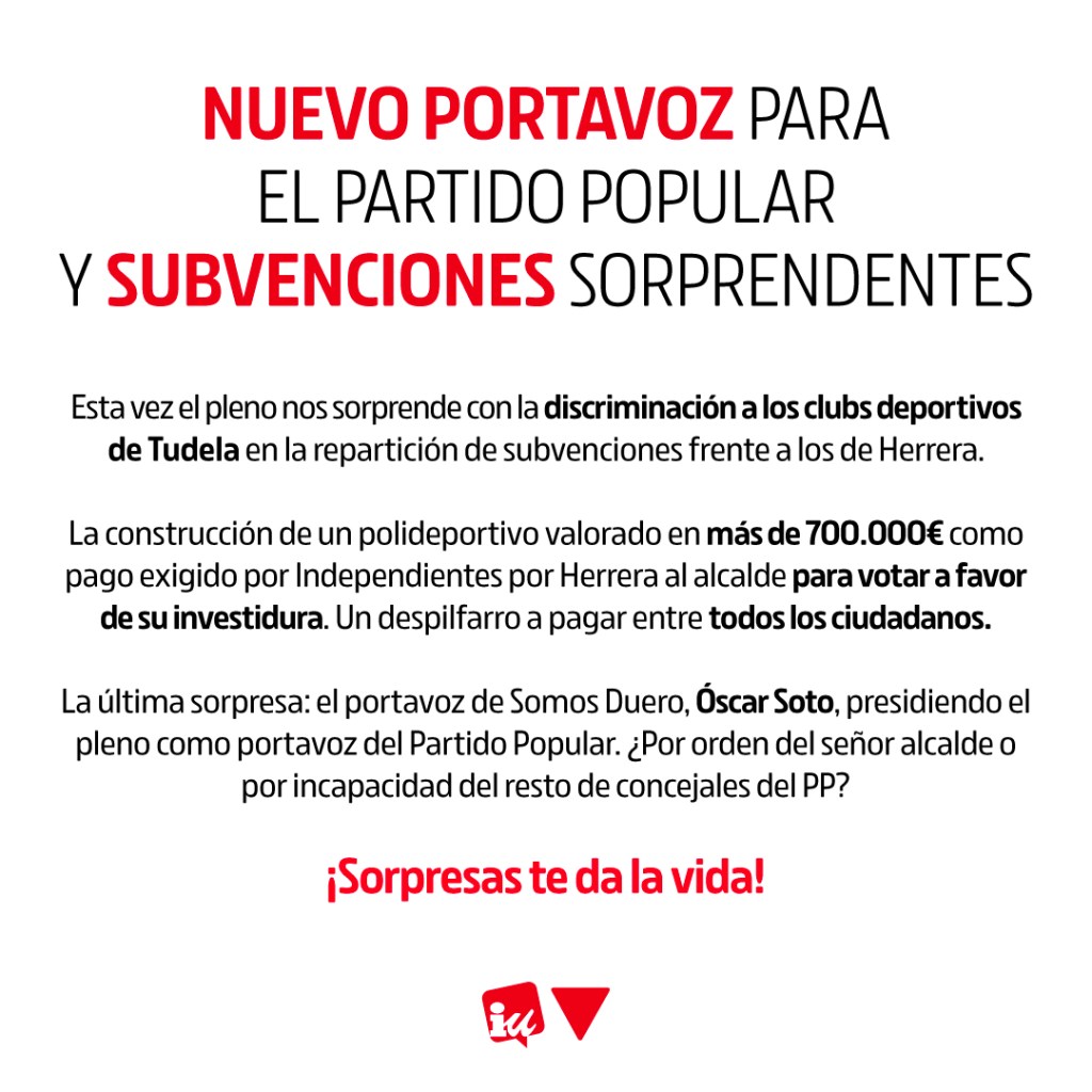 Nos llama especialmente la atención la discriminación que sufren los clubs deportivos de Tudela, a los que se les exige contar al menos con el 80% de participantes empadronados, mientras que si el club es de Herrera los empadronados serán solo el 65% de los participantes. Esto se debe, según ellos, a la dificultad que tienen en Herrera para conformar equipos. Dudamos que esto sea legal, ya que diga lo que diga este equipo de gobierno de momento Tudela y Herrera siguen siendo un mismo municipio.