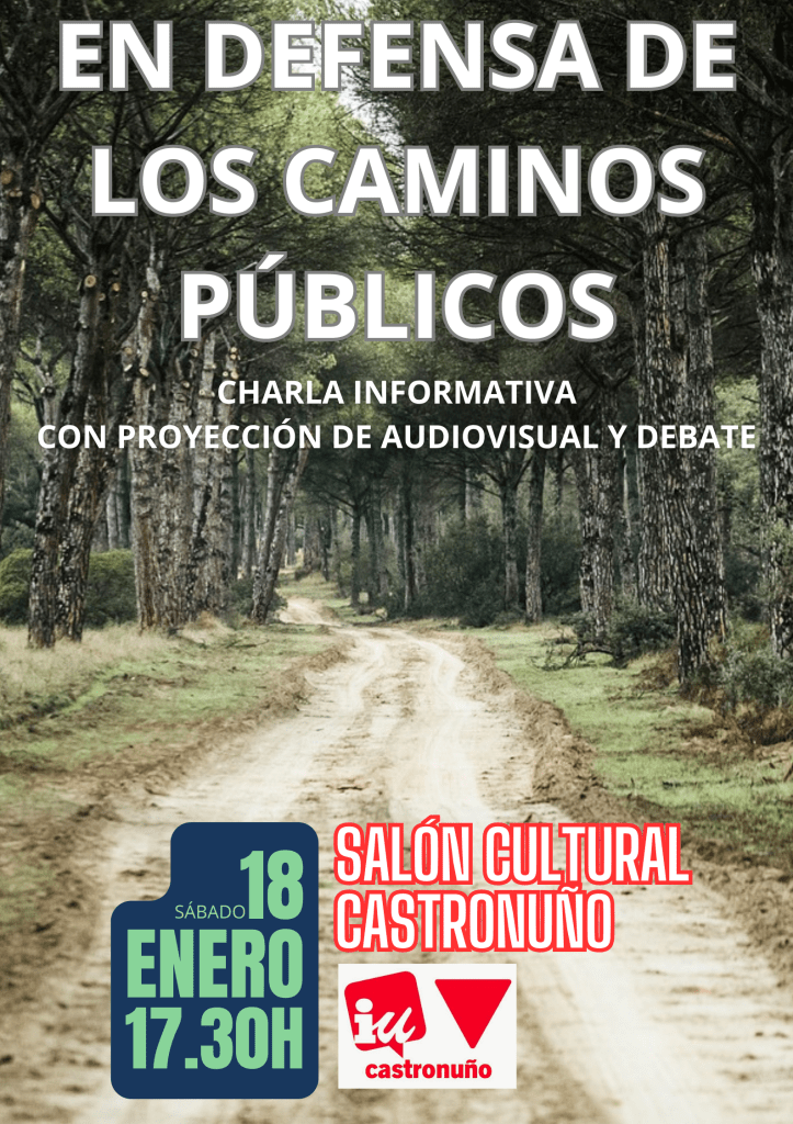 En el acto, que estará abierto a la participación del público asistente, se proyectará un audiovisual en defensa de los caminos públicos y miembros de IU Castronuño expondrán la situación en la que se encuentran algunos de los viales públicos del municipio. Será el sábado 18 de enero a las 17:30 horas en el Salón Cultural (bajos del edificio)